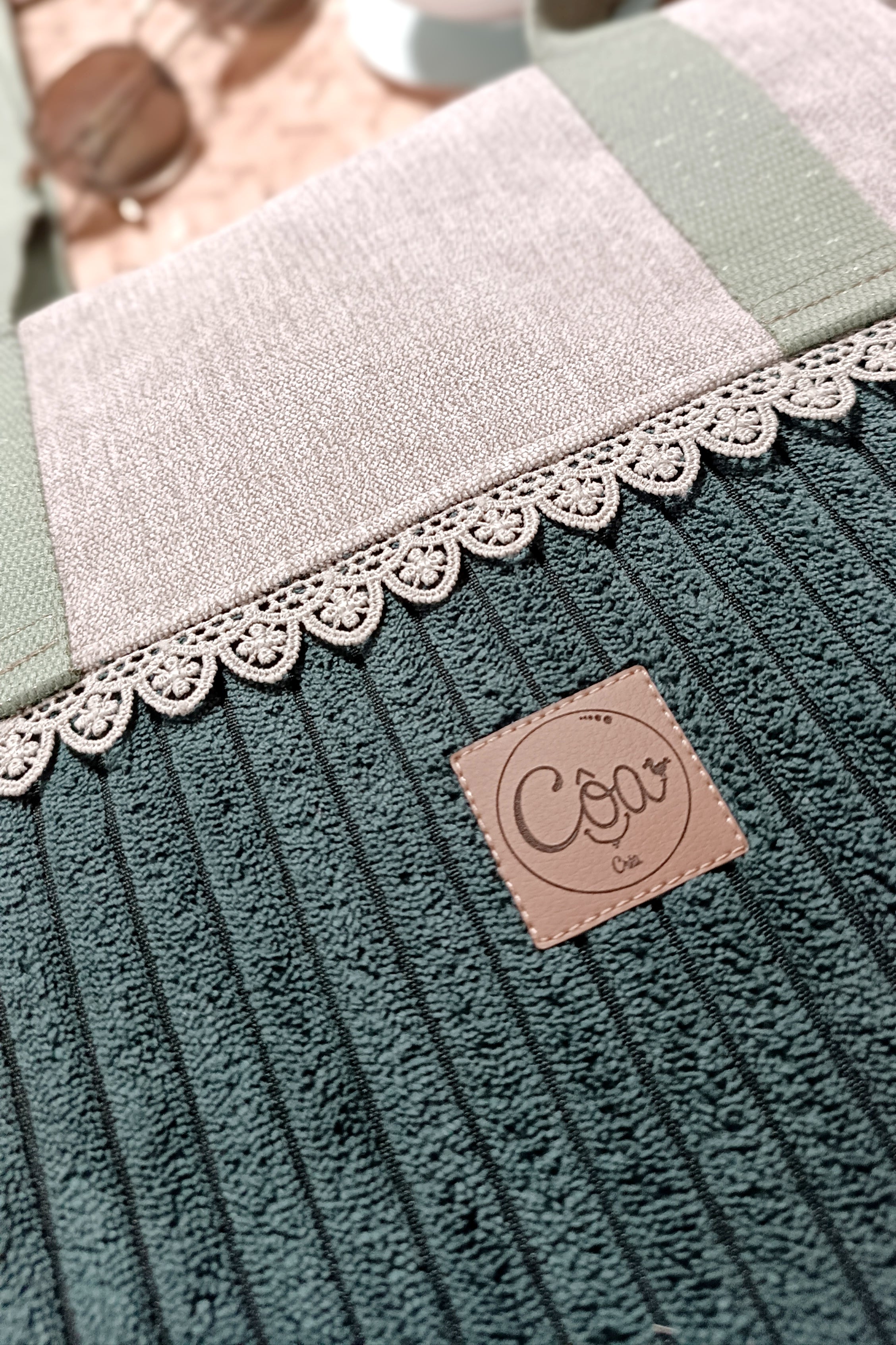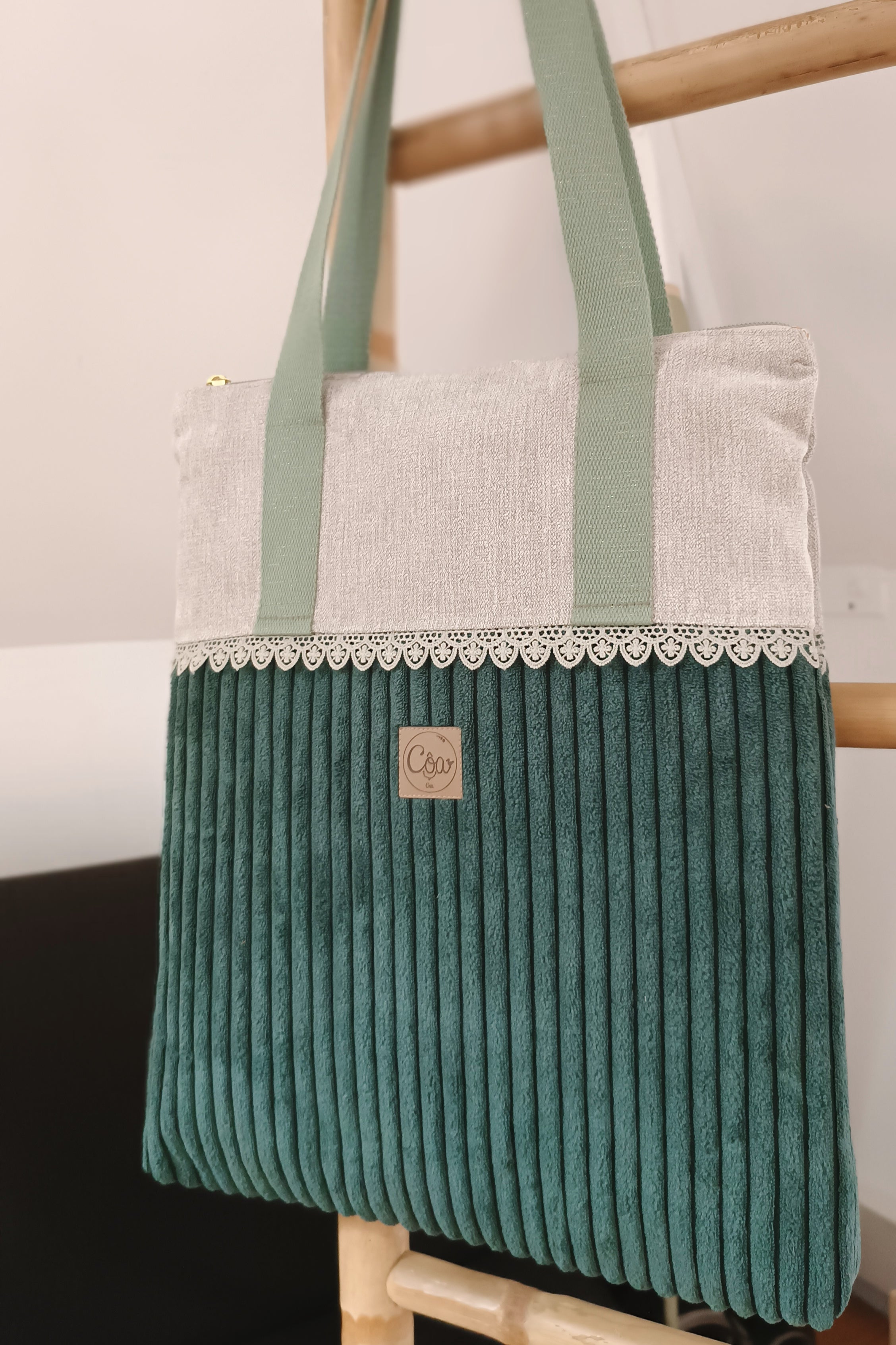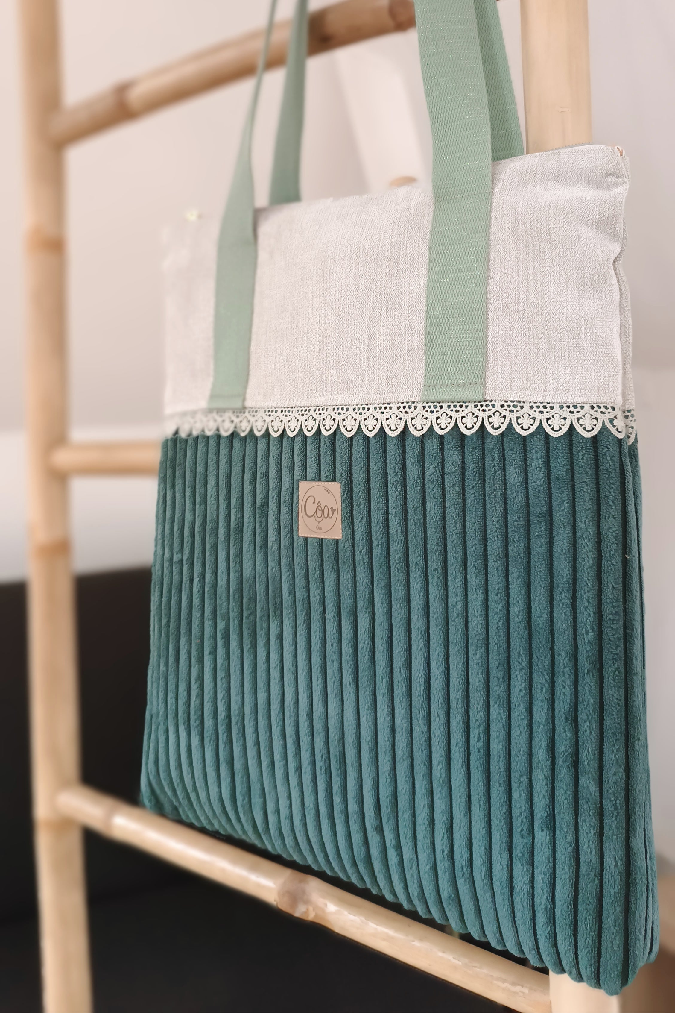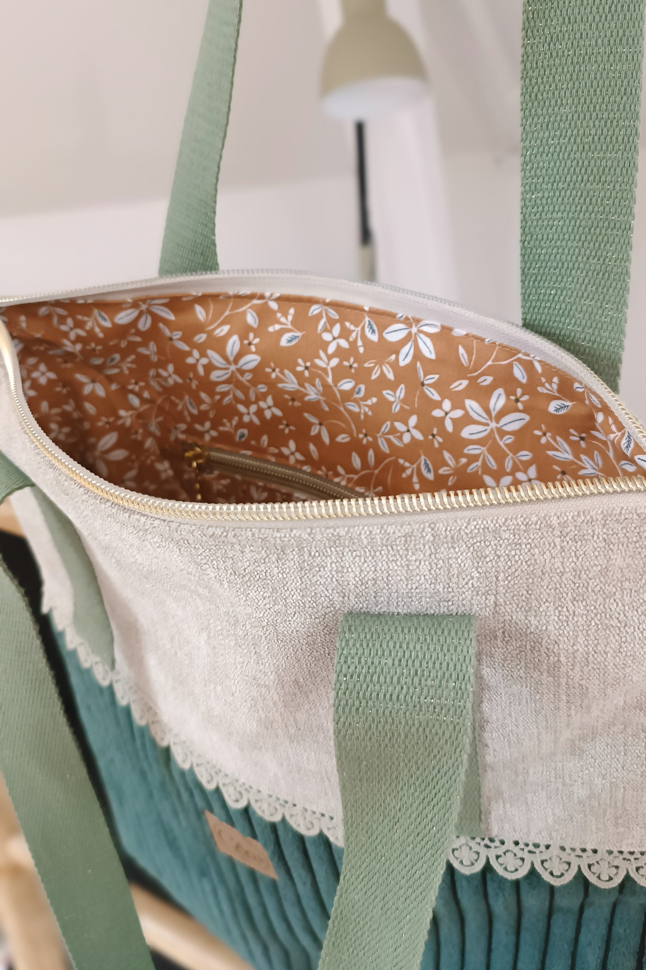 L'ossature principale a été réalisée en velours côtelé et suédine chinée entoilée. Les doublures et la poche intérieure sont en coton imprimé, certifié Oekotex.