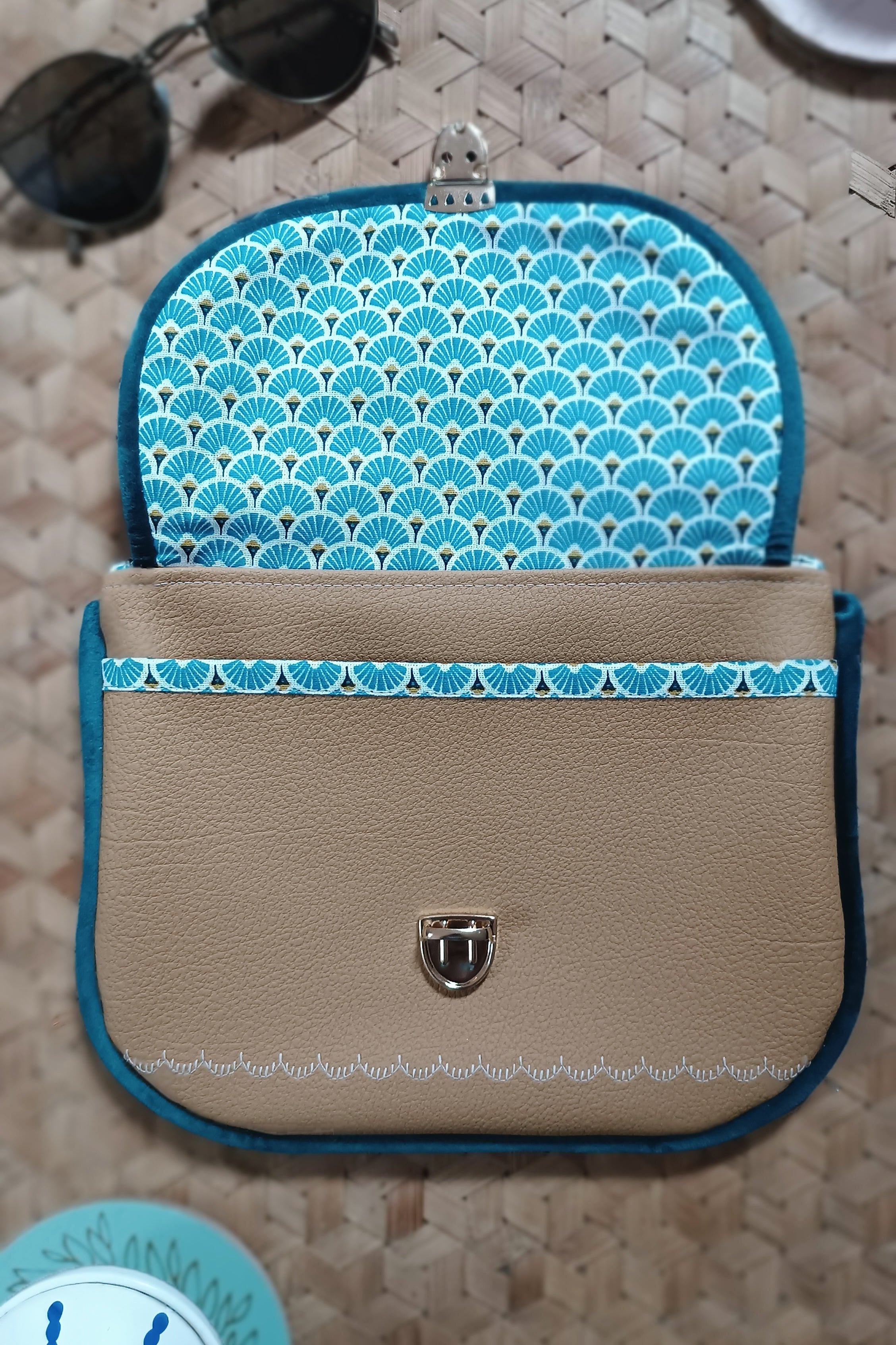 Elle a été réalisée en simili cuir, suédine et coton imprimé Oeko Tex.
