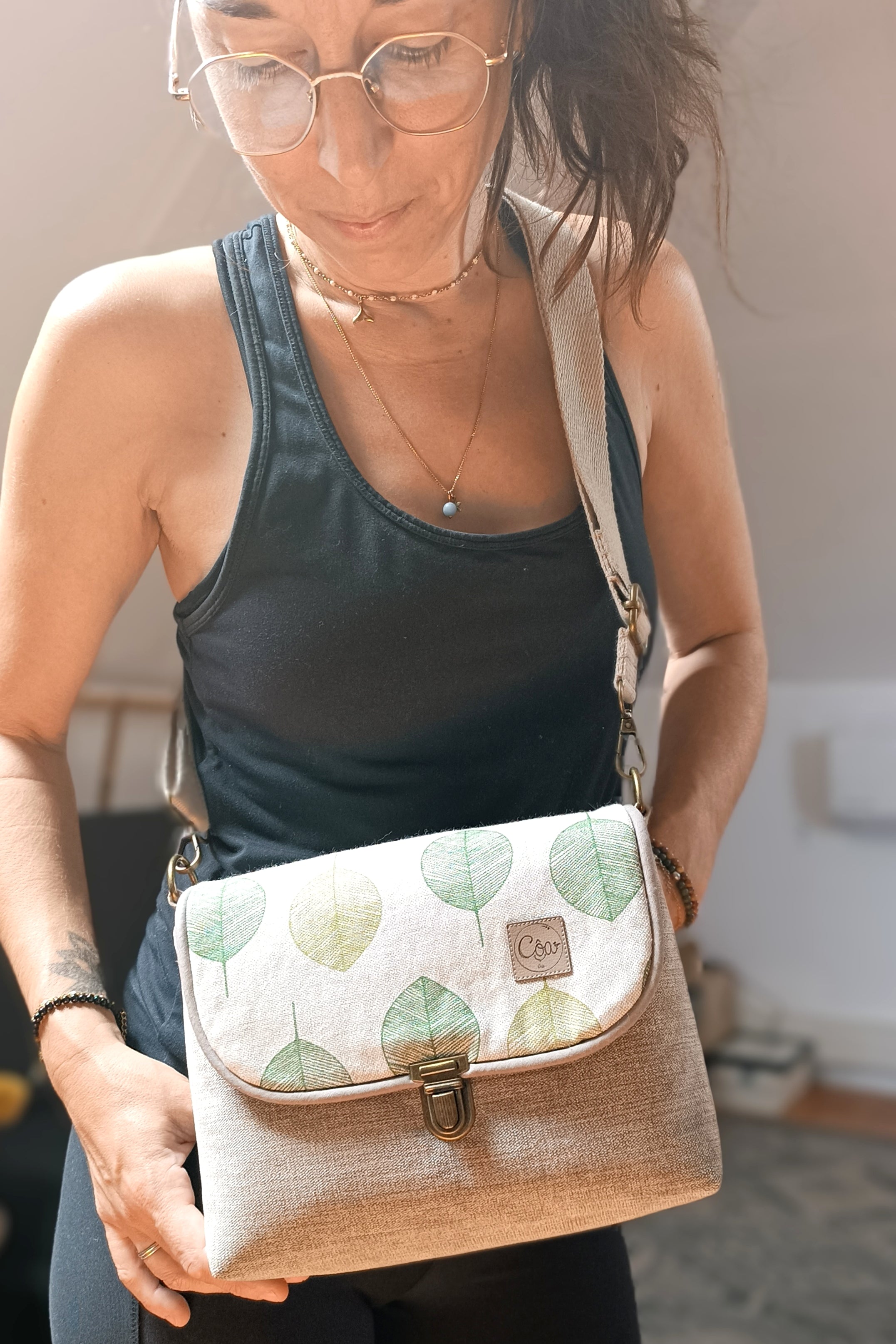 L'ossature principale a été réalisée en suédine chinée beige. Les doublures, le rabat et la poche sont en coton.