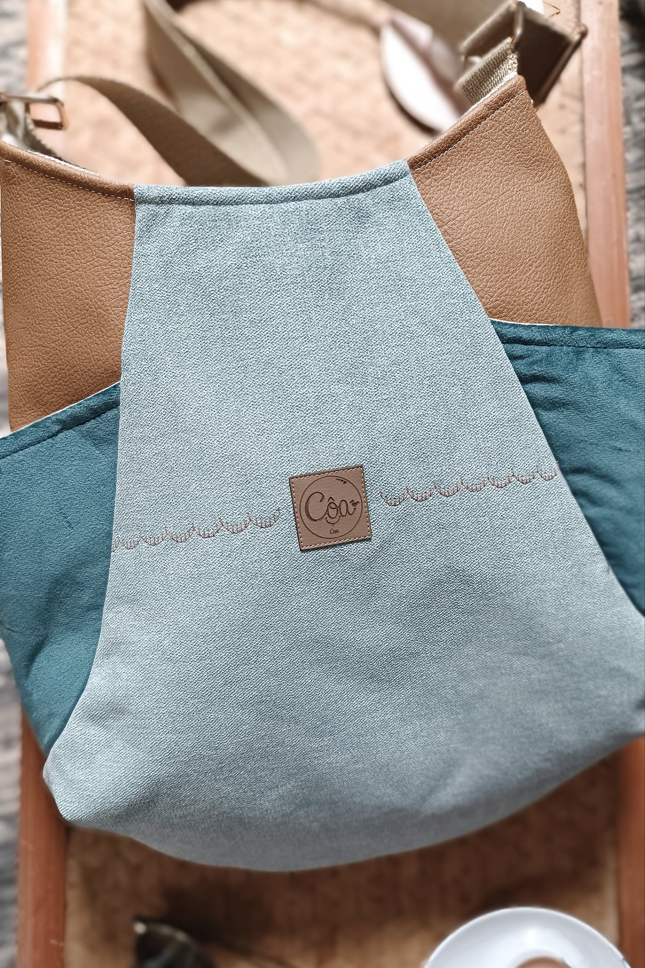 L'ossature principale a été réalisée en suédine chiné ciel, velours bleu et simili cuir camel. Les doublures et la poche zippée sont en coton.