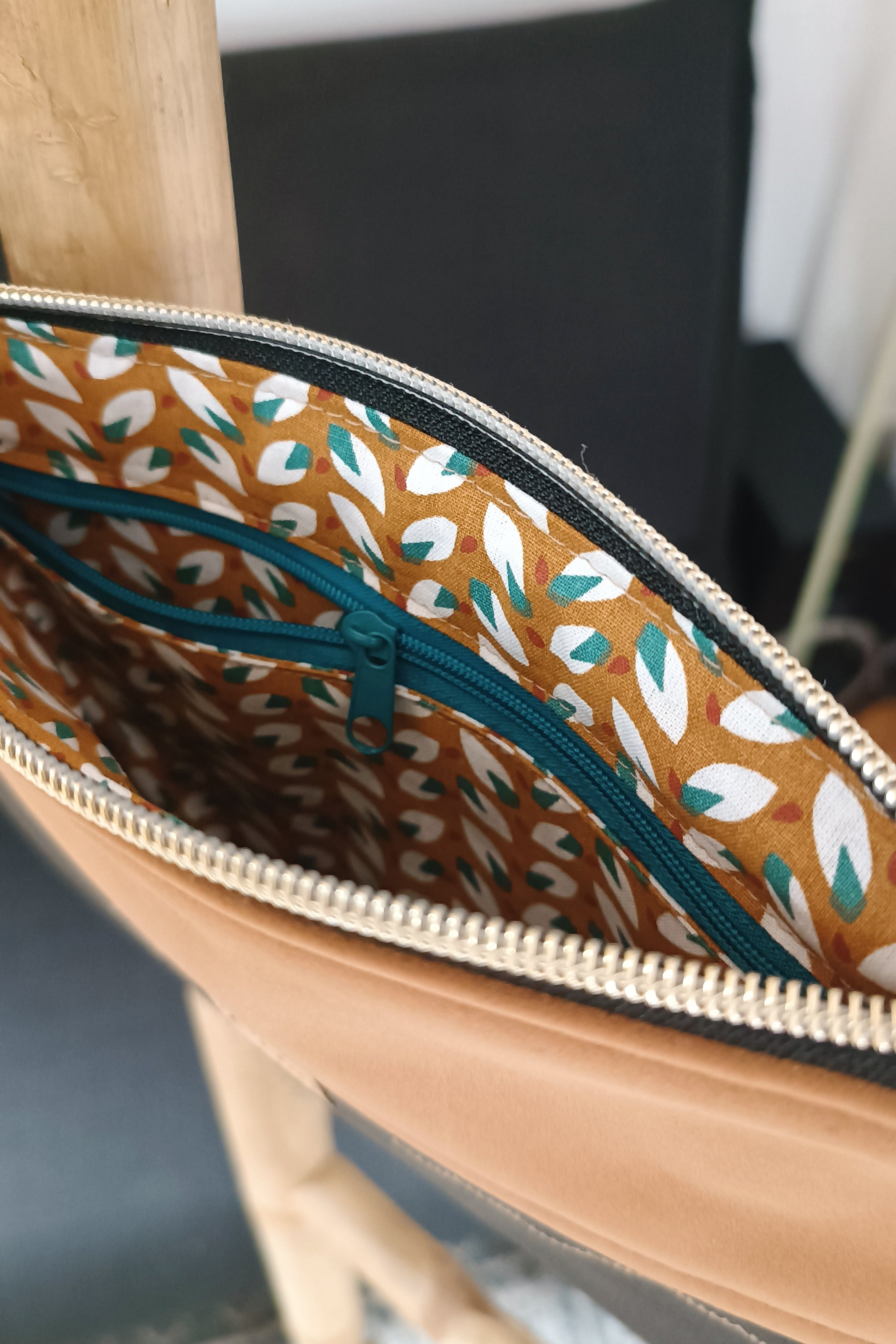 Le haut de l'ossature est en velours ras camel, la doublure, le bord de bandoulière et la poche sont en coton Oeko Tex.