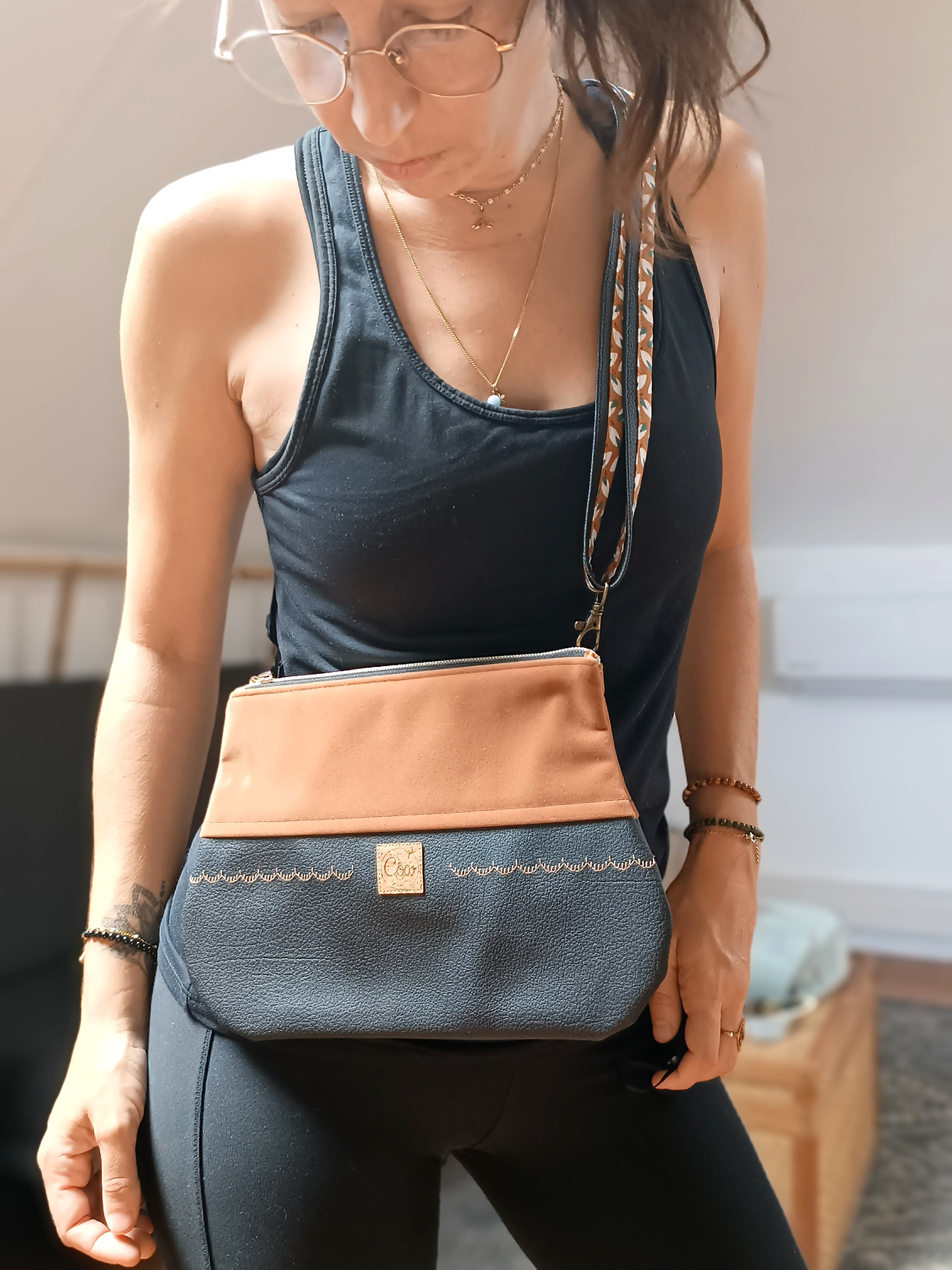 Sa bandoulière assortie, ajustable et amovible permet d'avoir les mains libres si besoin et de remplacer le sac à main.