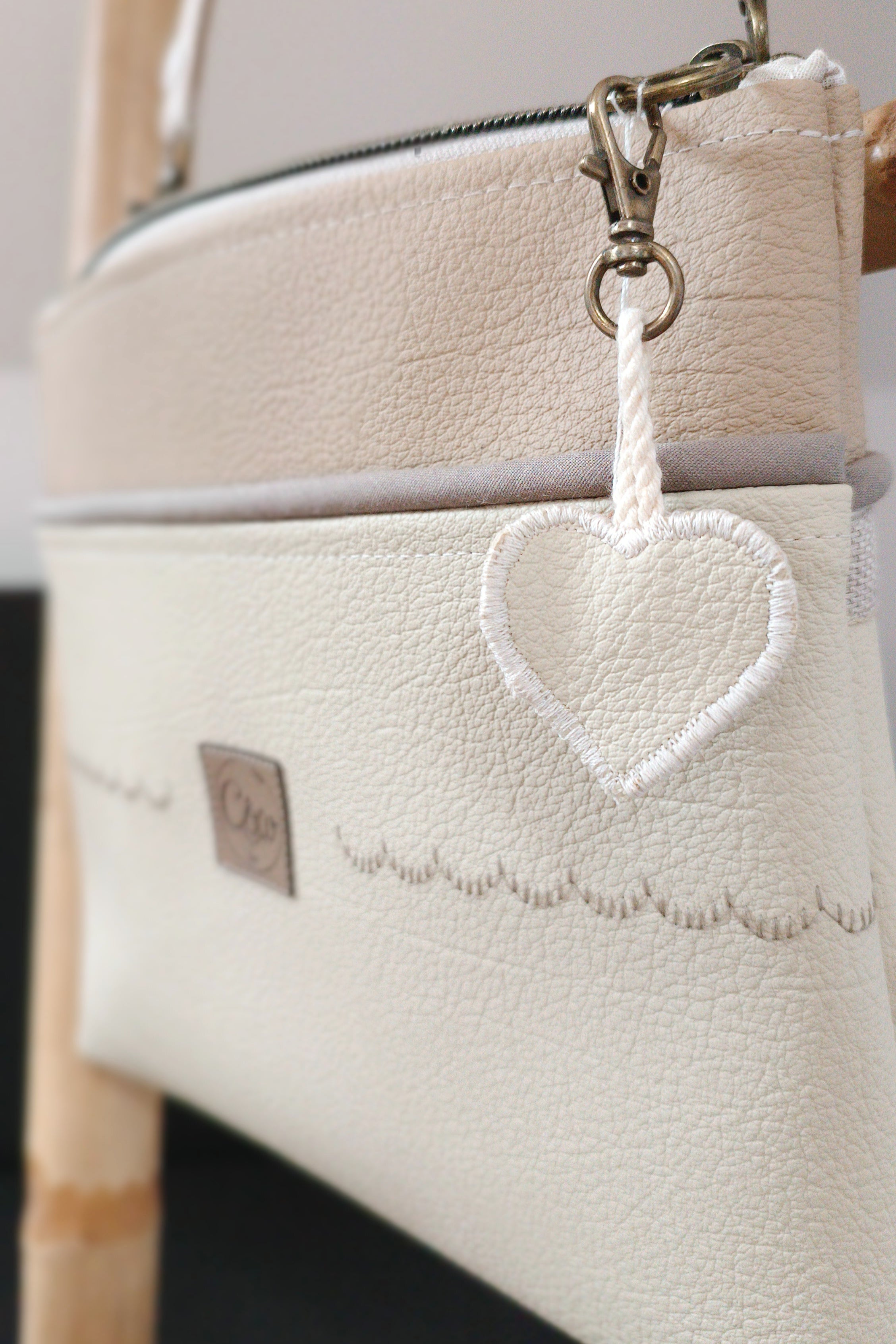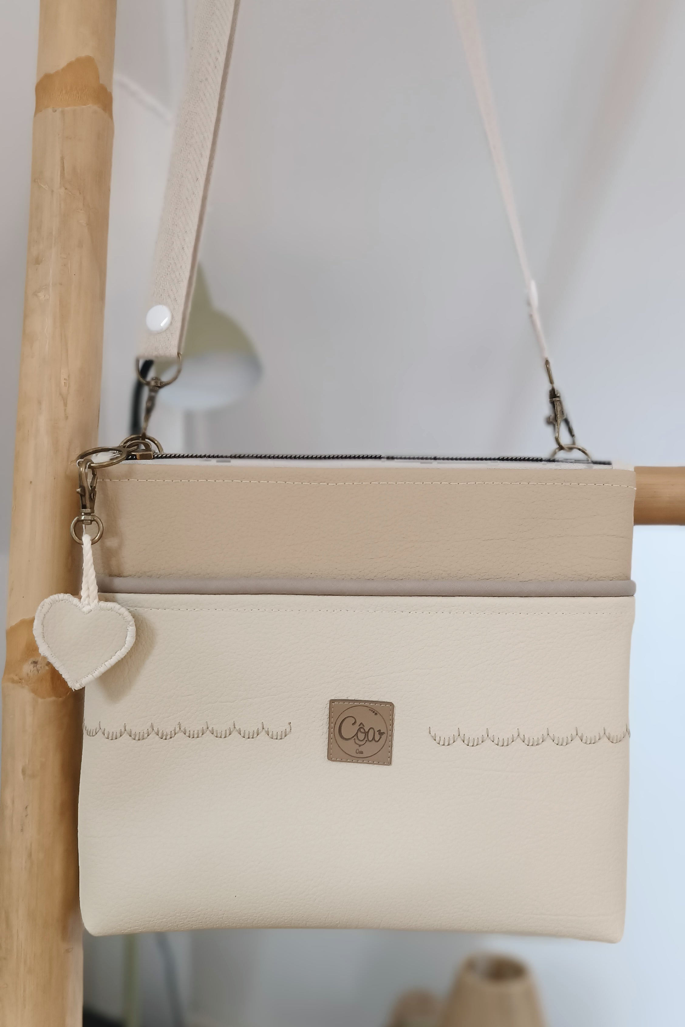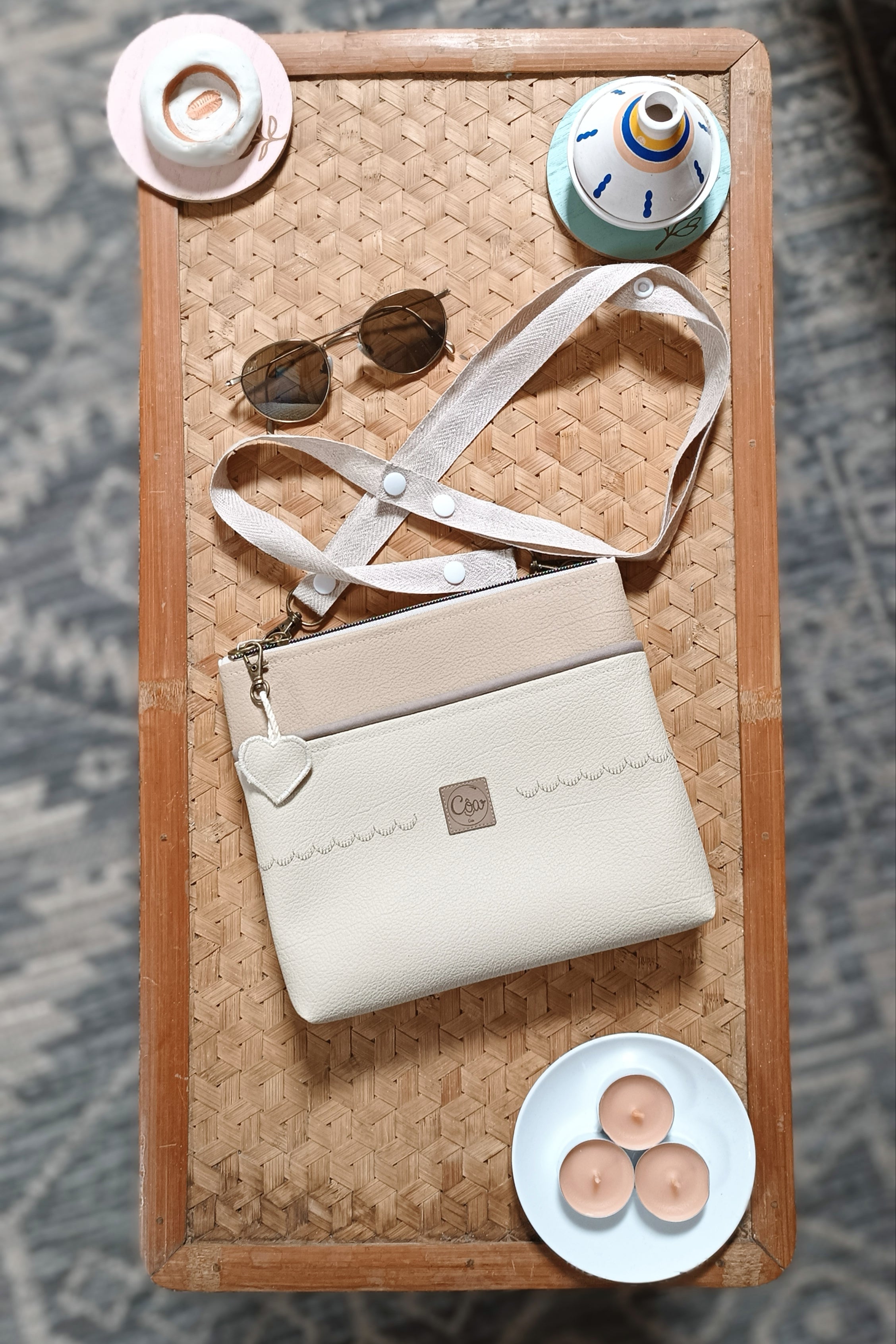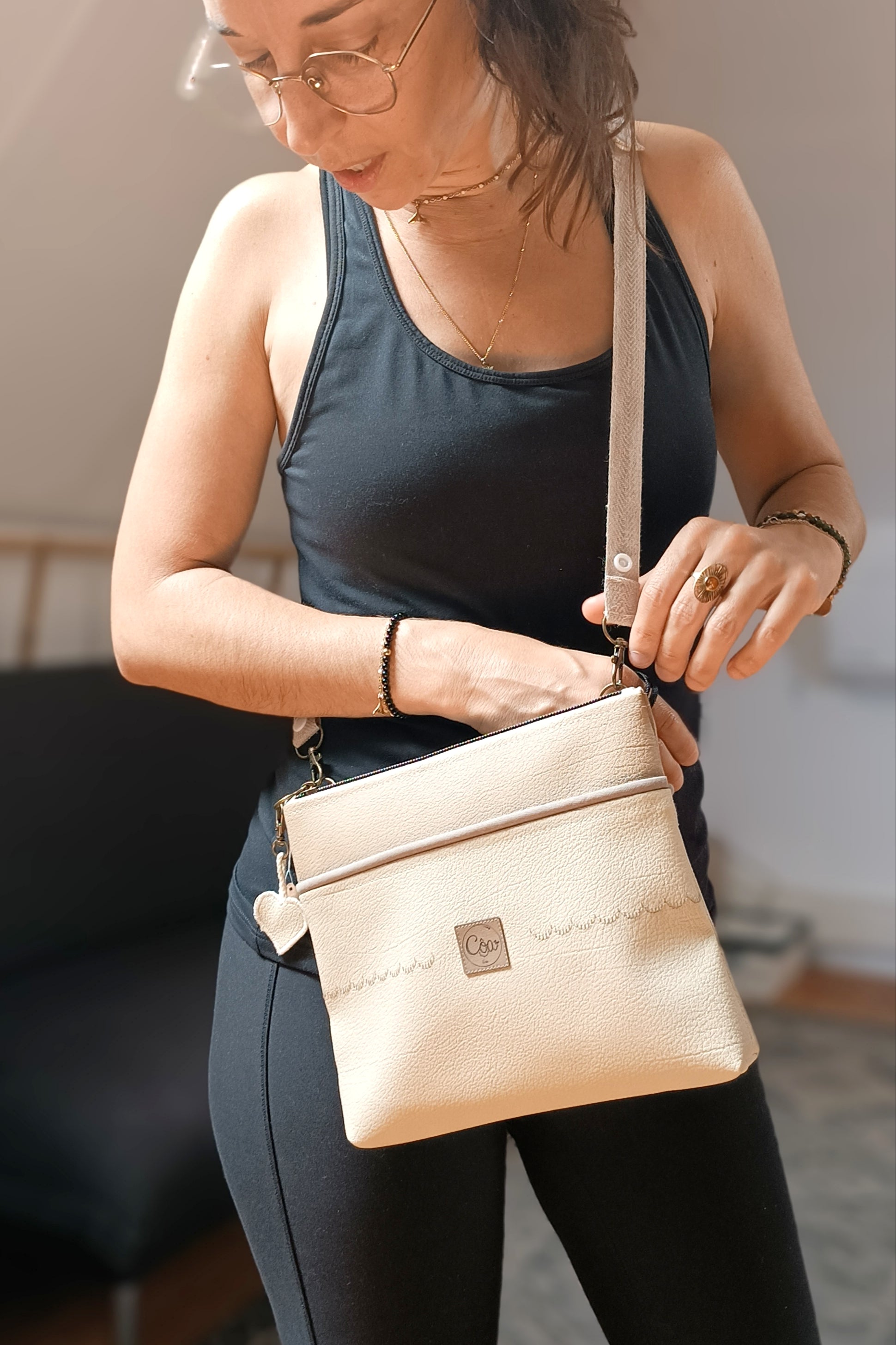 Sa longue bandoulière, ajustable par pressions et amovible, permet d'avoir les mains libres si besoin et de remplacer le sac à main.